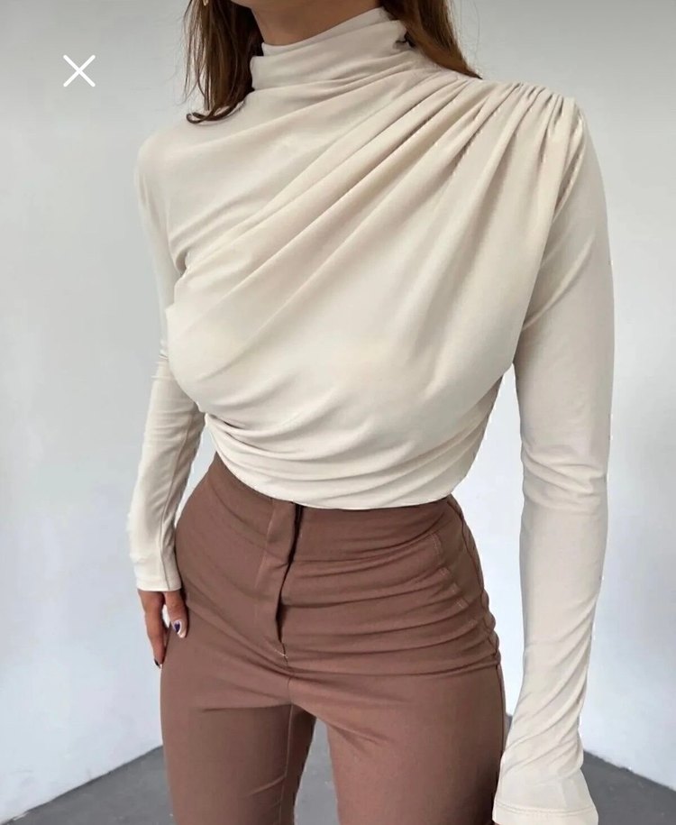 Kadın dik yaka omuz ve bel büzgülü uzun Kollu Bluz