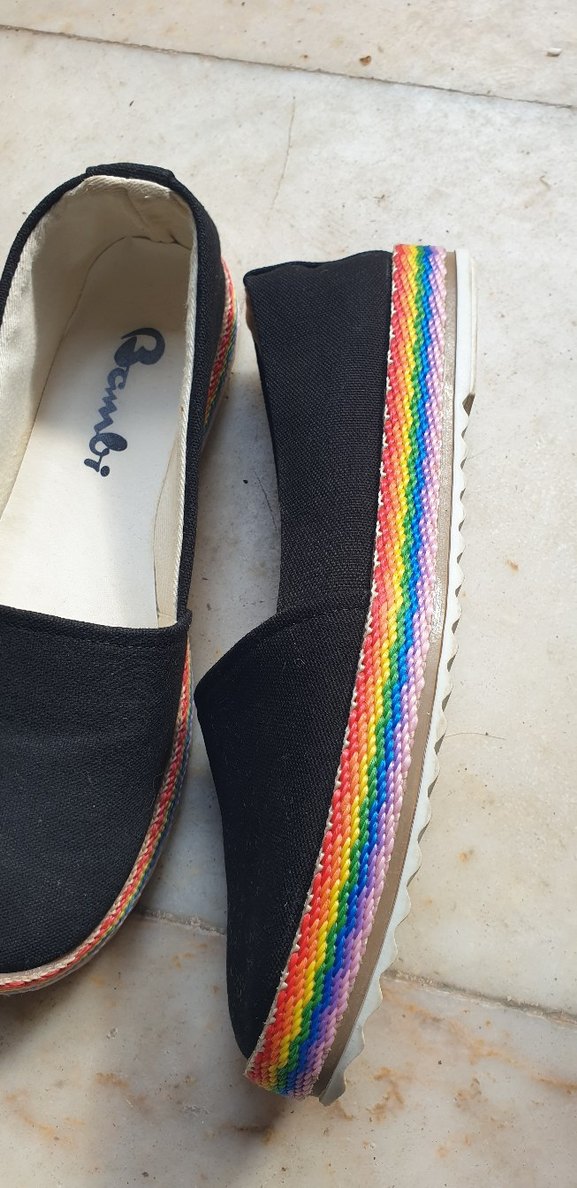Kadınlar için renkli dolgu topuklu espadril, siyah kumaş üst kısmı ve renkli gökkuşağı desenli taban. Sokak stili için uygun.