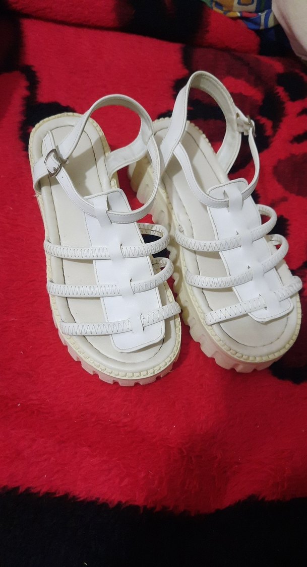 Beyaz tokalı, kauçuk malzemeden yapılmış kadın dolgu topuk sandalet. Minimalist ve şık tasarımıyla günlük sokak stiline uygun.