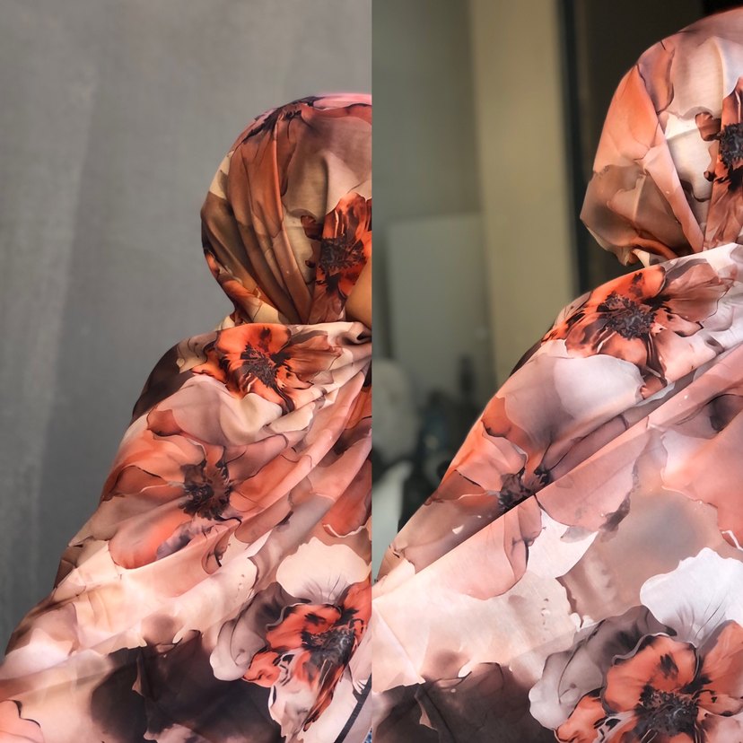 Kadınlar için drapeli tasarıma sahip, saten dokulu, koyu karamel zeminli ve canlı çiçek desenli şal.