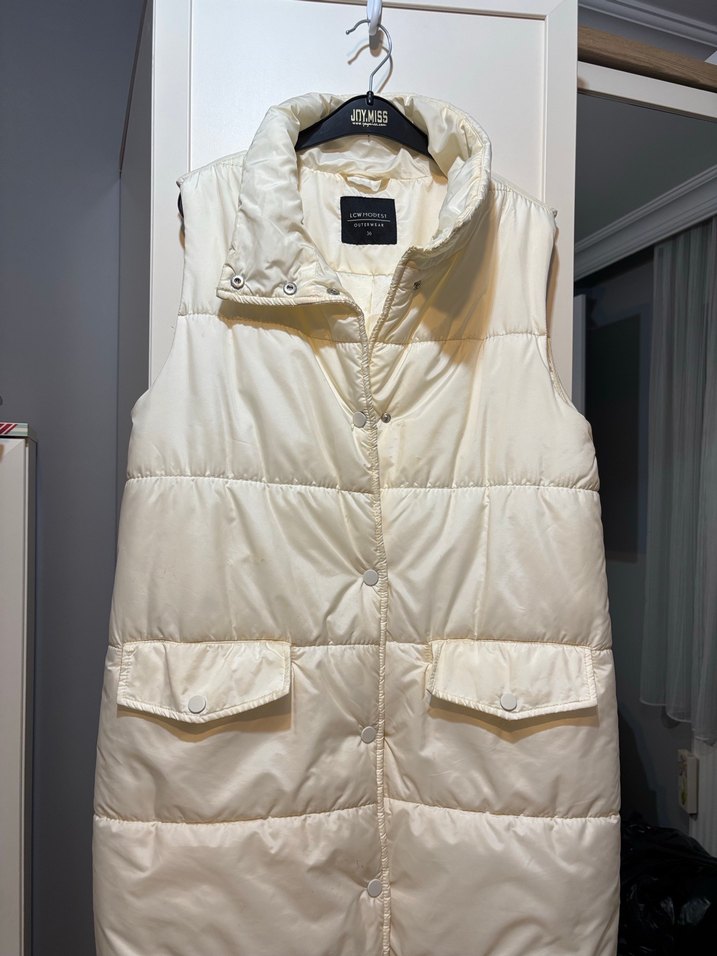Düğmeli, yüksek yakalı beyaz yelek, sentetik kumaştan üretilmiş, normal uzunlukta ve rahat kesimlidir. Günlük kullanım için uygundur. Ufak tefek lekeleri var silince yada yıkayınca geçer ben uğraşmadım hiç