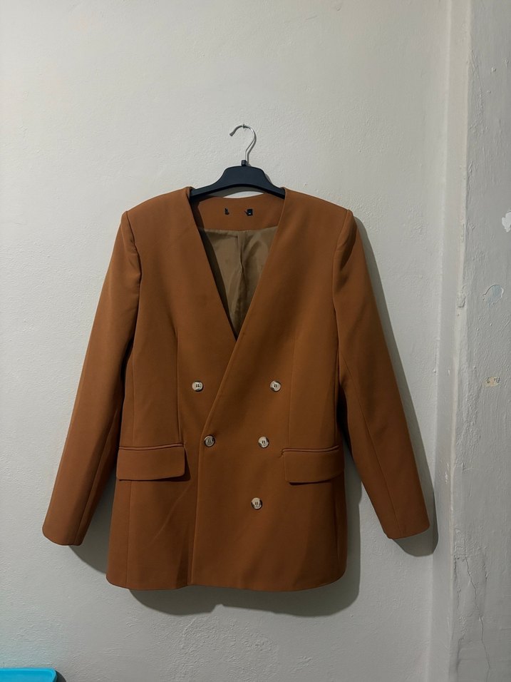 Kahverengi süet kumaştan, düğmeli, normal boy, uzun kollu kadın blazer ceket. Ofis için uygun, sade ve şık tasarıma sahiptir.