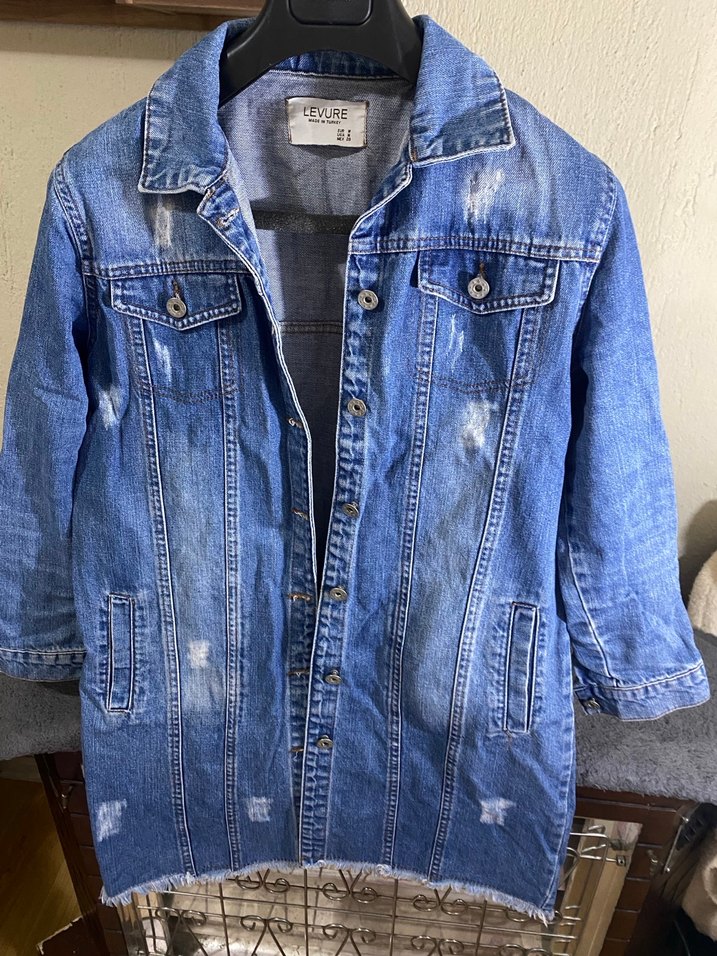 Omuz 43 cm Göğüs 48 cm Kol 54 cm Boy 81 cm Kadın mavi denim ceket, düğmeli, uzun kollu ve notlu yaka detaylıdır. Rahat kesimi ve parlak görünümüyle sokak stiline uygundur. Marka etiketi 'LEVUR'.