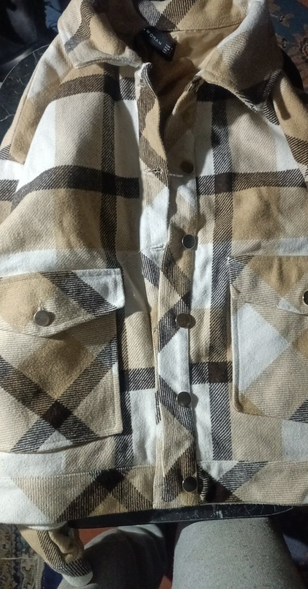Kadınlar için düğmeli, uzun kollu ve notalı yakalı bol kesim ceket. Yumuşak dokulu kahverengi ve gri ekose desende, günlük kullanım için uygundur. hiç giyilmedi