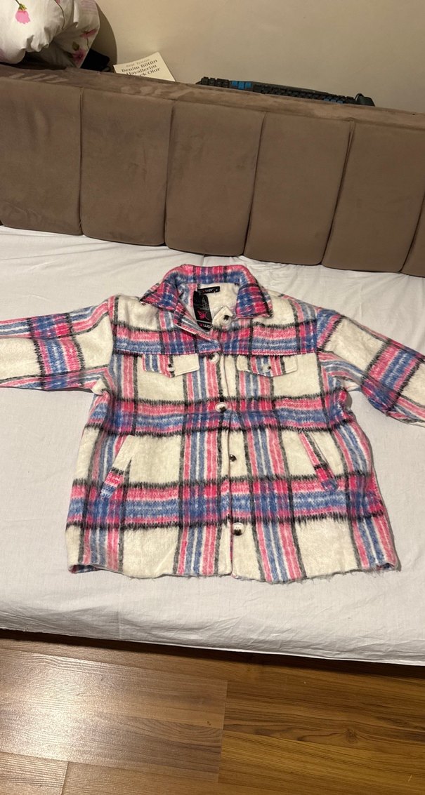 Düğmeli, notched lapel yakalı ve uzun kollu kadın oversize gömlek. Yumuşak ve sıcak kumaştan, pastel tie-dye desenli, gündelik kullanıma uygun.