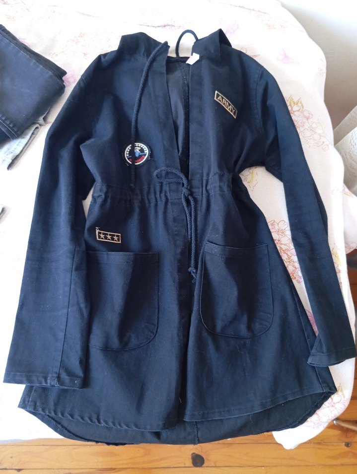 Kadınlar için siyah denim ceket, düğmeli ön, uzun kollu ve cepli. Rahat kesimiyle günlük sokak stiline uygun.