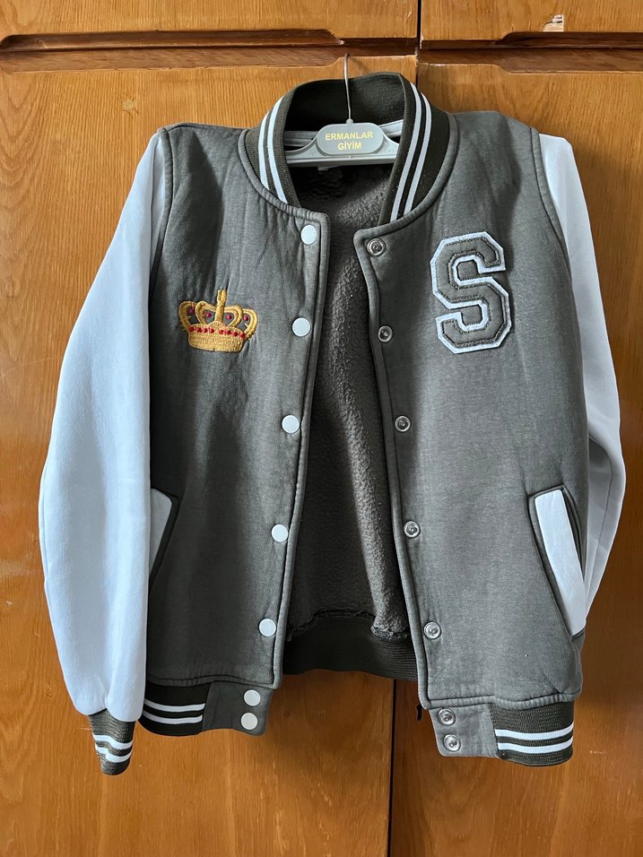 Düğmeli, yakalı ve baskılı detaylı, gri ve beyaz renkli, yumuşak dokulu kadın ceket. Street wear tarzında, vücuda oturan kesim.