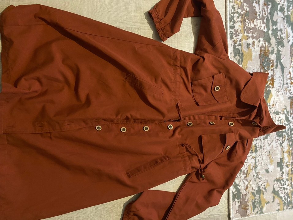 Düğmeli, kahverengi uzun trençkot, notlu yakalı ve bol kesim. Parlak sentetik kumaştan, günlük rahat stil için uygun. Kiremit rengidir sıfır gibi büyük geldiği için kullanamadım 44 46 beden olur diye düşünüyorum