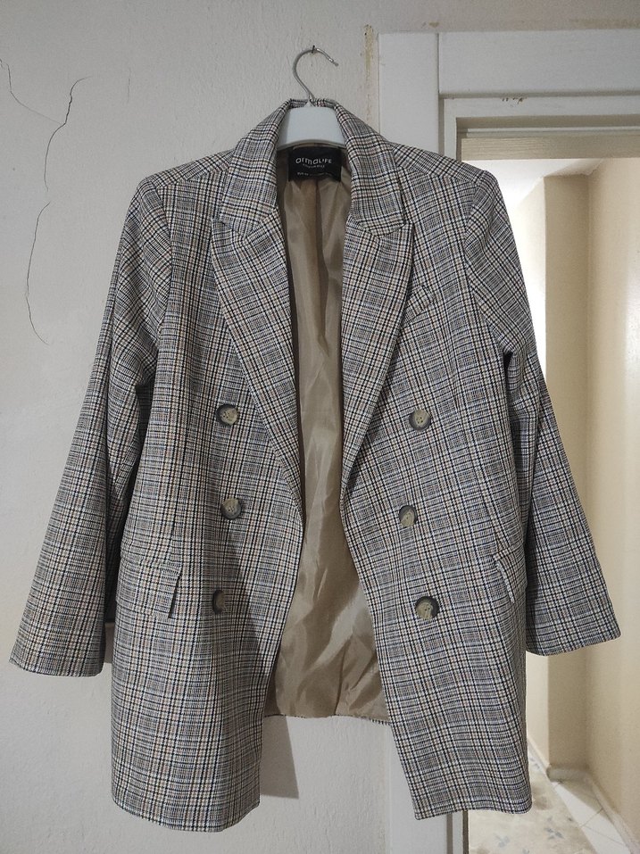 Gri ekose desenli blazer. Normal kesim, günlük sokak stiline uygundur.