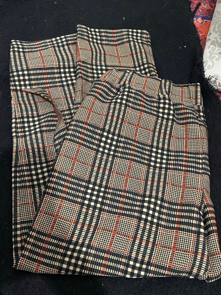 Kadınlar için ekose desenli, pilili ve sentetik kumaştan yapılmış pantolon. Normal kesim ve midi boyda, günlük kullanıma uygun, koyu kahverengi tonlarında.
