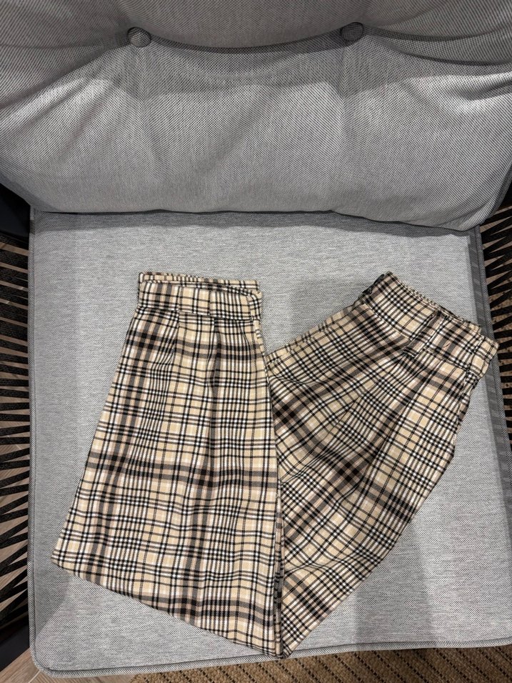 Kadınlar için ekose desenli, pilili kumaş pantolon. Bej ve gri tonlarında, rahat ve trend sokak stili sunar.