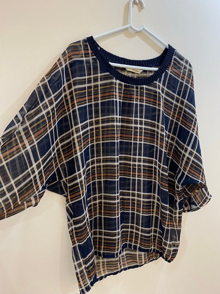 Kadınlar için salaş kesim, yuvarlak yakalı ve kısa kollu bluz. Transparan