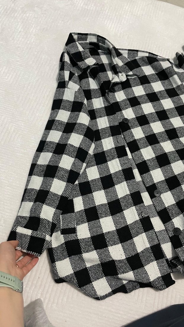 Kadınlar için koyu gri ekose desenli, düğmeli, notalı yaka ve uzun kollu salaş gömlek. Yumuşak sentetik kumaştan yapılmıştır.