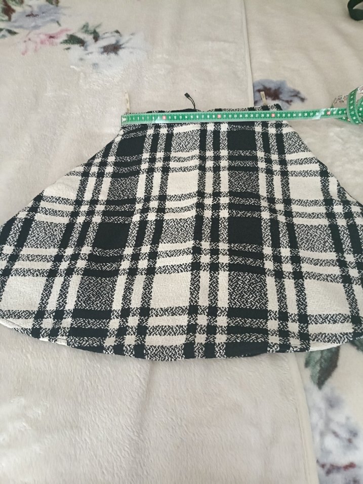 Kadın ekoseli mini etek, gevşek kesim ve beyaz gri renklerde. Sentetik kumaştan, kürk detaylı, günlük sokak stili için uygundur.