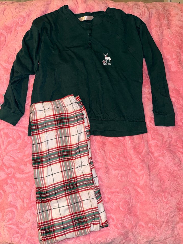 Kadınlar için bol kesim, uzun kollu pijama takımı. Üstü koyu renk ve küçük işlemeli detaylı, altı ekoseli rahat pantolon.hic giyilmedi sadece bir kez makineye atilip yikandi
