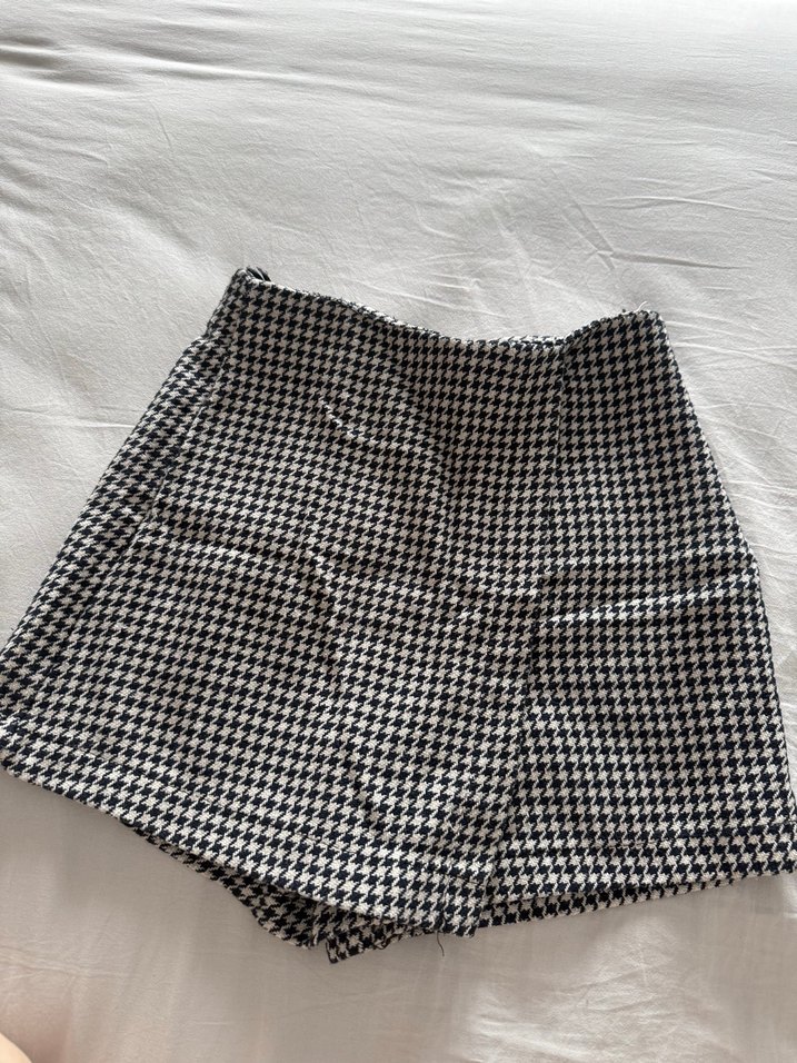 Kadınlar için siyah-beyaz kazayağı desenli,sentetik kumaştan yapılmış dar kesim mini etek. Günlük sokak stili için uygundur.