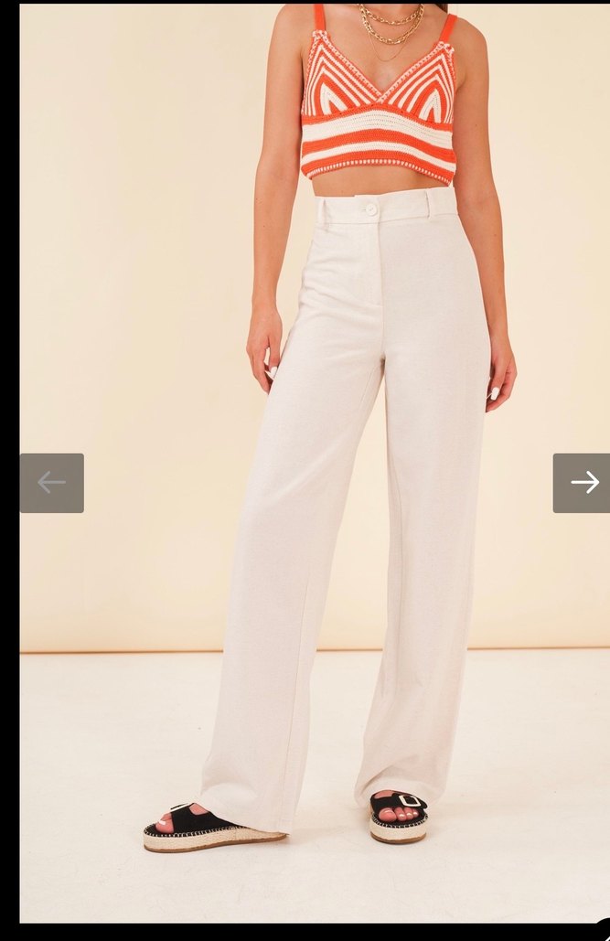 Kadın ekru keten yüksek bel bol paça pantolon