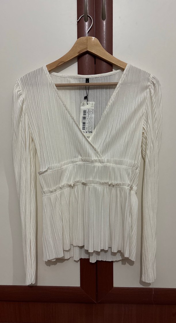 Ekru bluz, piliseli tasarımı, uzun kollu ve V yakalıdır. Doğru iç çamaşırıyla iç göstermiyor.
