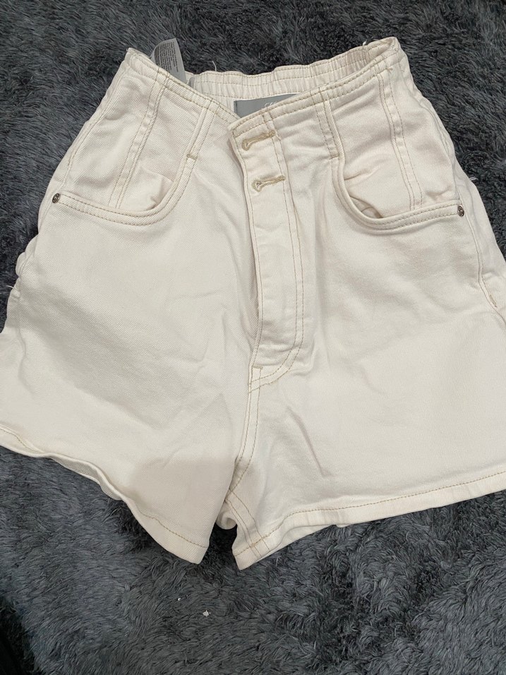 Pamuk kumaştan, bol kesim ekru yüksek bel mini şort. Günlük kullanım için rahat ve şık bir sokak stili sunar.