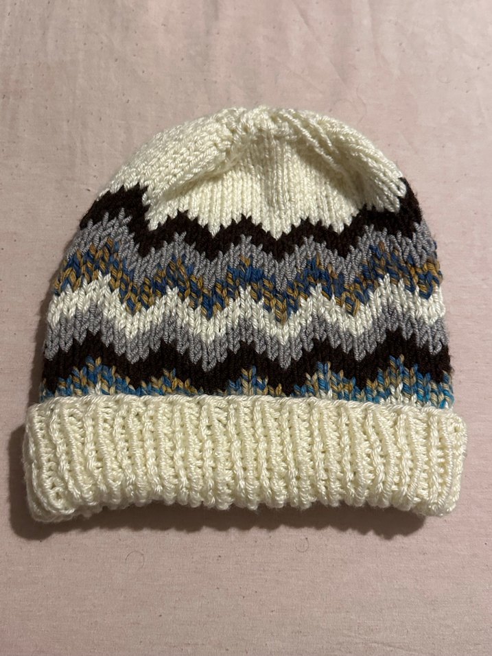 Kendim ördüm Kadınlar için örgü, gri ve beyaz tonlarında, rahat ve bohem tarzda zigzag desenli bere.