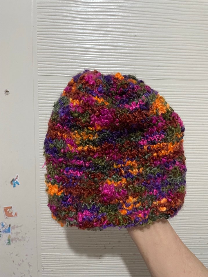 Renkli iplerle örülmüş, rahat ve bohem tarzda kadın bere. Canlı renkleriyle retro ve hippie havası yaratır.