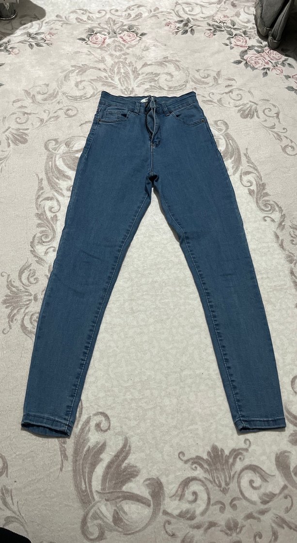 Kadınlar için elastik bel bağcıklı, mavi denim kumaştan yapılmış, bağcıklı ve sıkı kesim jean. Günlük kullanıma uygun, normal boyda ve tie-dye desenli.