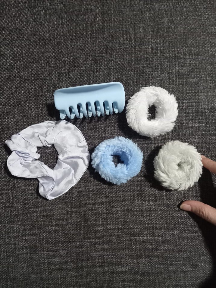 Pastel mavi ve gri tonlarda mandal, peluş ve saten elastik saç tokaları yeni beşli set birlikte, pembe saç tokası ve yumuşak, rahat ve şık görünüm sağlar. Farklı renk ve çeşitleri için sayfama bakabilirsiniz.