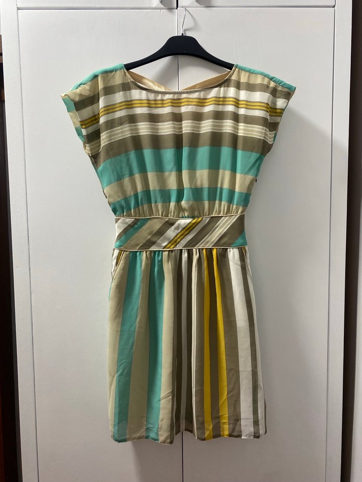Çok renkli çizgili desenli mini kadın elbise.