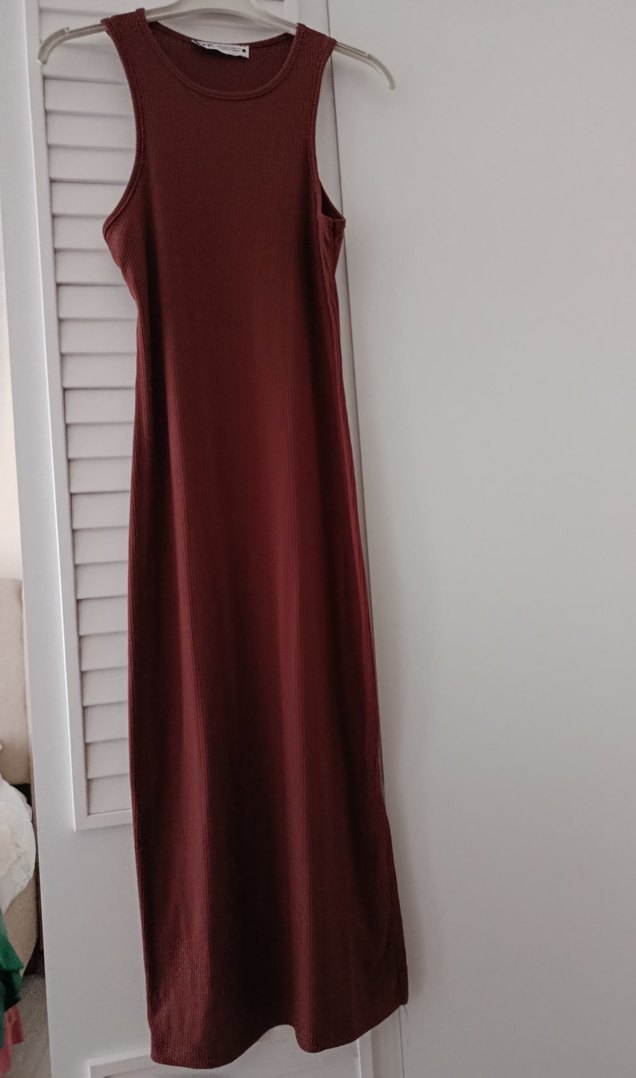 kahverengi renk, kolsuz, uzun ve vücuda oturan elbise. Yüksek yakalı ve dökümlü detaylı sentetik kumaş Günlük kullanım için uygundur. yan tarafları yırtmaçlı