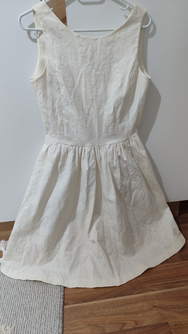S beden, jakar kumaş.1 sefer giyildi. Sadece birkaç yerinde küçük lekeler var.Üzerine inci dikilebilir, kuru temizleme de denenebilir. Sonn 3 fotoğrafta ekledim. #elbise#beyazelbise#jakarelbise#nikshelbisesi#kısaelbise#kadınelbise