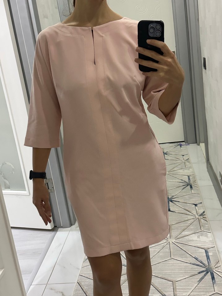 Rengi toz pembedir. 1 kez giyildi. Göğüs kısmında kopçası var. Yandan iki ceplidir