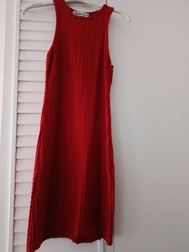 Kiremit renk , triko dokulu kumaş, yüksek yakalı ve kolsuz midi elbise. alt kısmında ufak bi delinme mevcut görsele ekledim