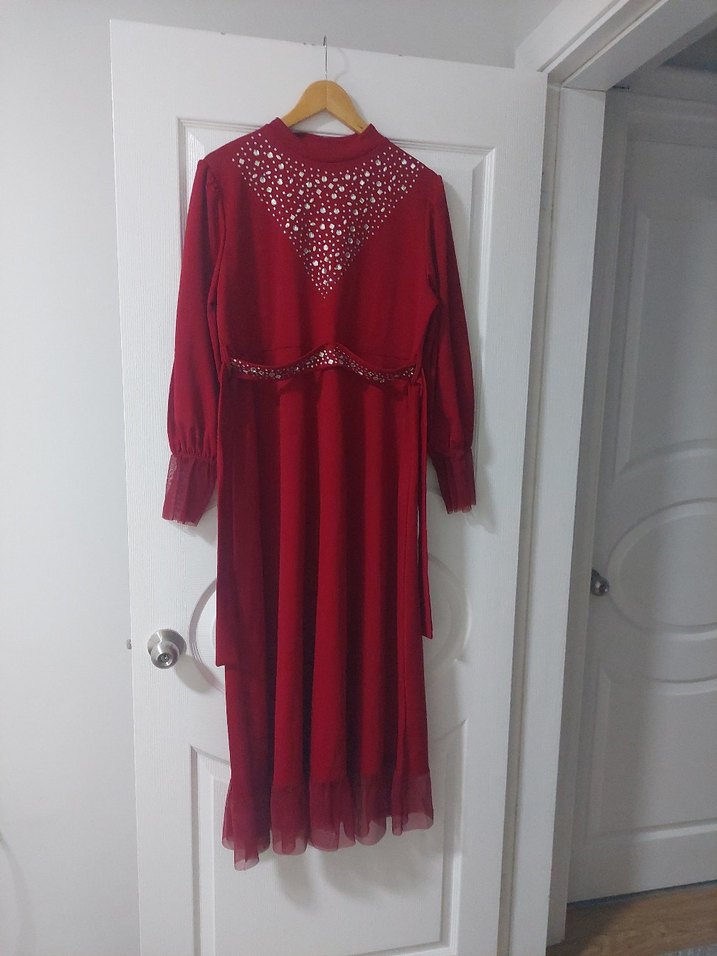 Bordo uzun elbise, V yakalı ve uzun kollu. Bol kesim, drapeli ve parlak nakışlı desenlere sahip, yumuşak sentetik kumaştan yapılmıştır. Düğün için uygundur.