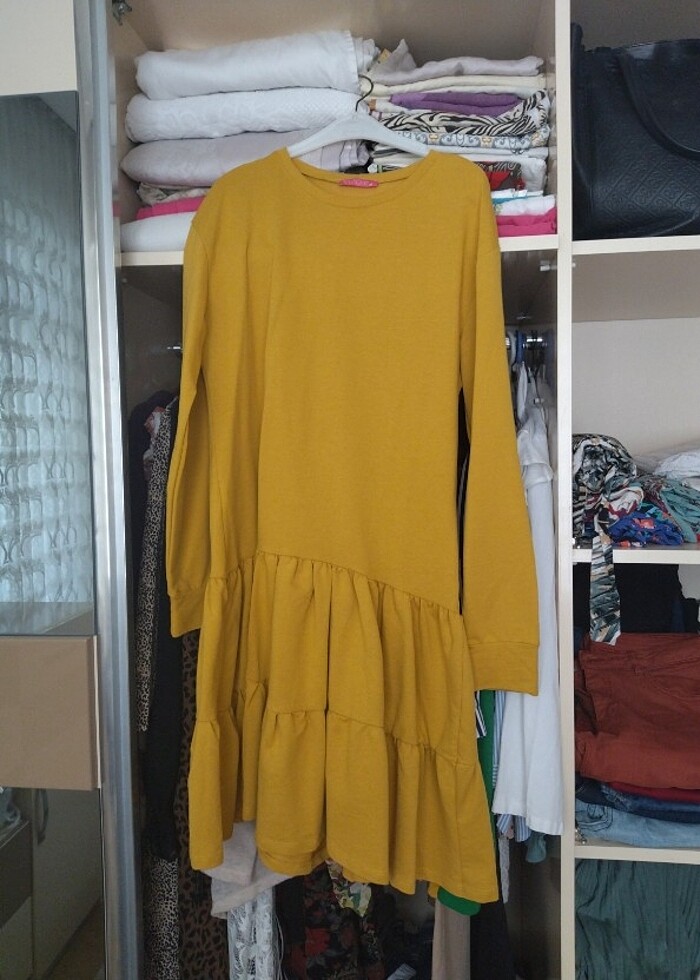 İnternetten çok beğenerek aldım ama rengini kendime yakıştıramadığım için yalnızca bir kez giydim.yepyeni. M beden ama L giyene de uyar