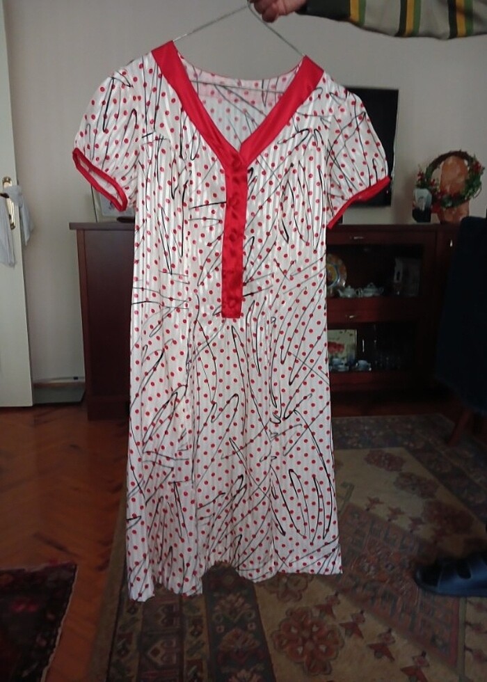 İpek saten kumaş, terzi dikimi, belden aşağısı klos etek, beli kusakli karpuz kollu kadın elbise. Az kullanılmış, temiz, hasarsız, kusursuz üründür. Krem rengi üzeri kırmızı puantiye ve siyah çizgilerden oluşur. Kırmızı beyeli ve kusaklidir. Bahar ve yaz aylarında tiril tiril bir elbise. Boy 100cm., bel 48 cmdir. M ve L bedene uyumludur. #vakko#beymen#zara#koton#elbise#abiye