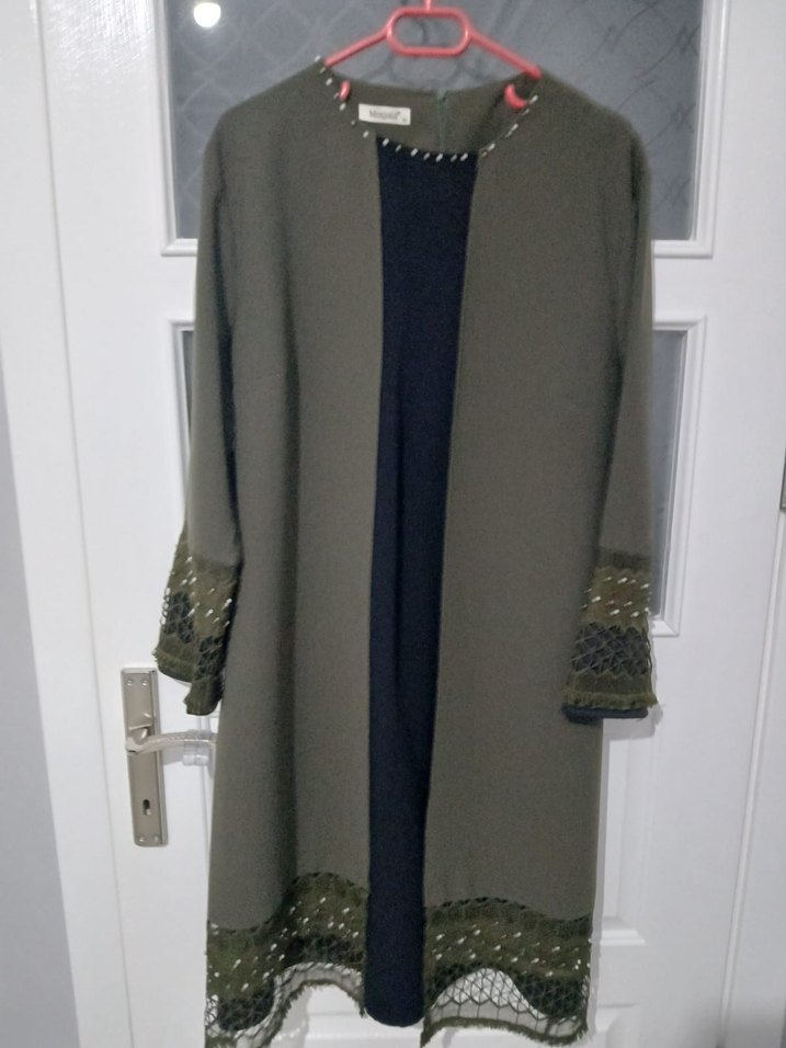 Haki yesili diz boyunda bilek ve etek ucunda nakış detayları mevcut çok az giyildi 54 beden