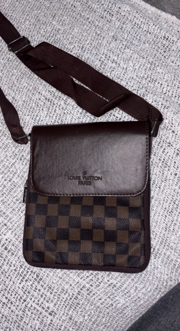 Kadınlar için kahverengi deri ve kareli desenli, tokalı kapaklı omuz çantası. Louis Vuitton Paris logosu bulunur, trend ve Parisli sokak stilini yansıtır.