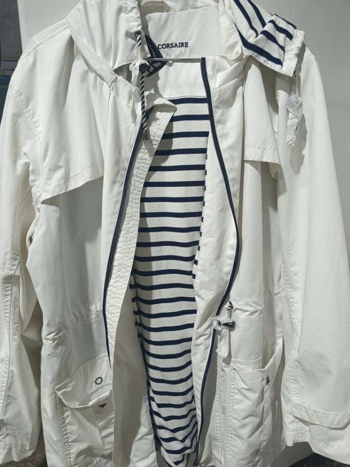 Erkekler kadınlar için uzun, beyaz pamuklu yağmurluk. Notlu yaka, askılı kollu ve fermuarlı tasarıma sahip. Çizgili iç astarı günlük kullanıma uygundur. Pazarlık payı vardır
