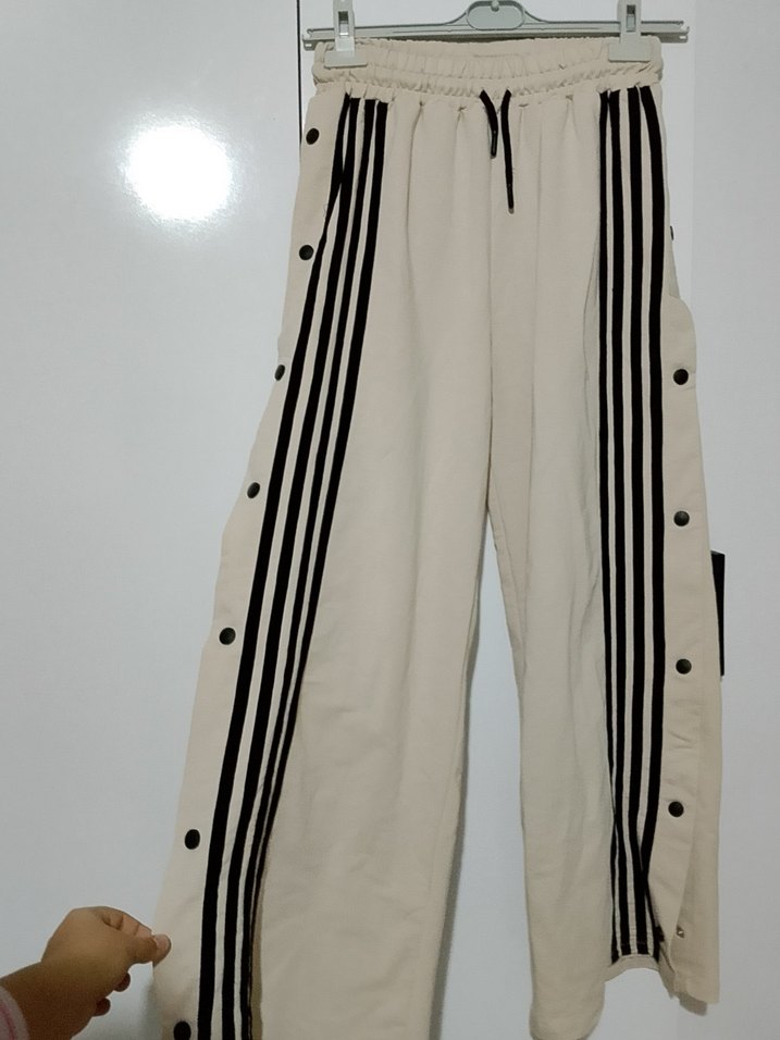 Pamuklu, düğmeli ve siyah şerit detaylı geniş kesim kadın eşofman altı. Günlük rahatlık ve sokak tarzı için uygundur.