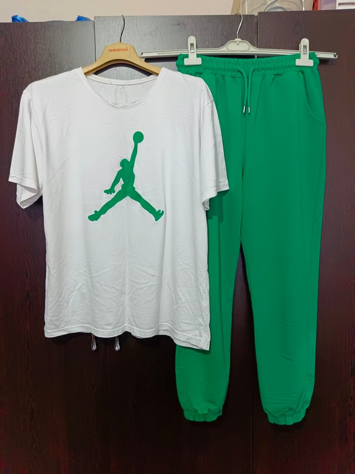Takım olarak almak zorunda değilsiniz sadece eşofmanı da alabilirsiniz. Spor salonunda giyinmek için aldım sadece 3veya 4 kere giyindim. Rahat kesim, beyaz kısa kollu üstte yeşil baskı ve elastik bel ile paçalı yeşil pamuklu kadın eşofman takımı. Konforlu ve günlük.