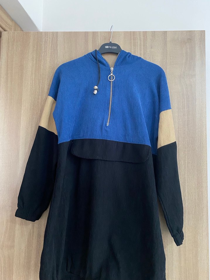 Uzun ve bol kesim kadın tunik koyu mavi ve siyah renk bloklu, kol kısmında bej detaylıdır. Uzun kollu, bisiklet yaka ve ön fermuarlıdır. Yumuşak kumaştan üretilmiş, günlük kullanıma uygundur. S- m beden içindir