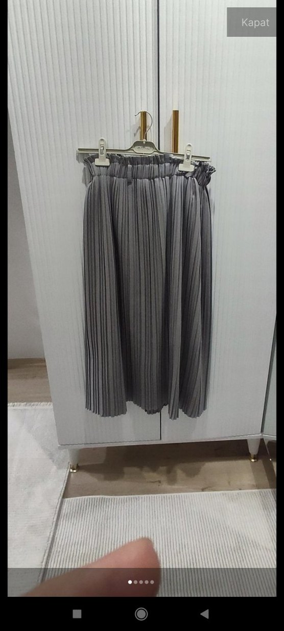 Gri piliseli midi etek, bol kesim ve yumuşak sentetik kumaştan yapılmıştır. Minimalist ve şık tarzlar için uygundur.