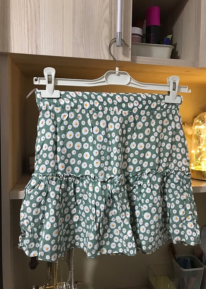 Kadın,beli lastikli,kat detaylı, yeşil,desenli,şortlu ; mini etek Boy;40 cm