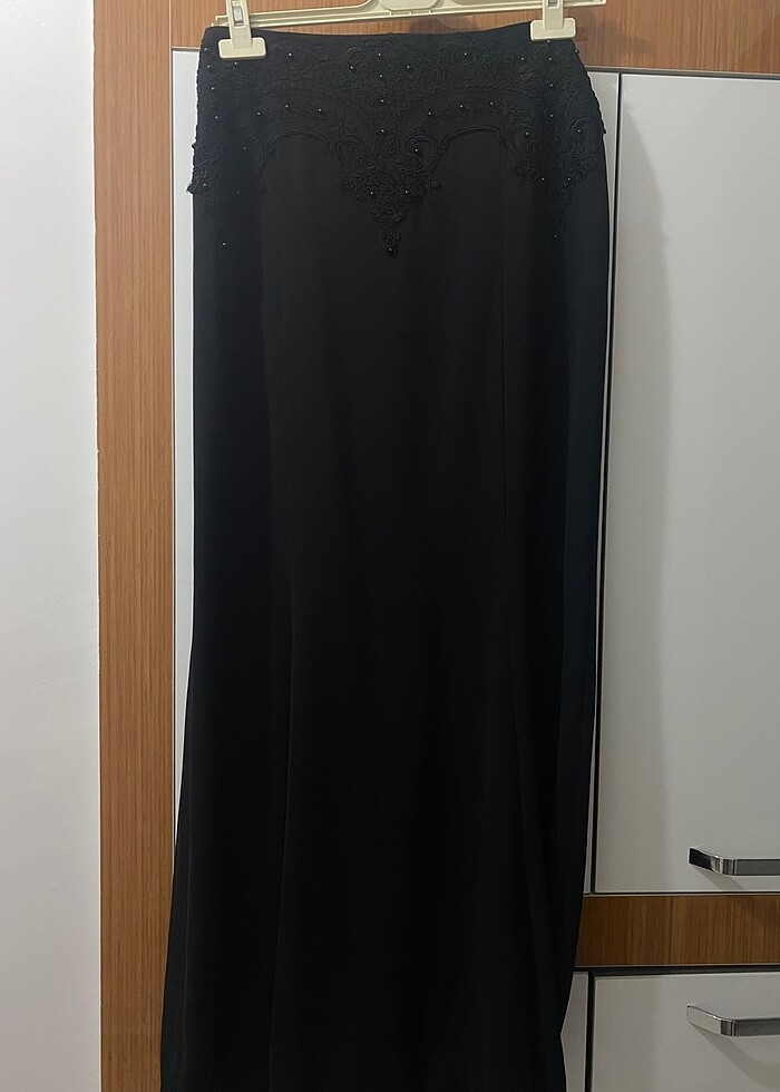 Dantel ve boncuk detaylı yaklaşık 1 karış kuyruklu etek. Sayılı giyildi hiçbir deformesi yok. Hafif balık modellidir. 40/42 beden uyumlu.