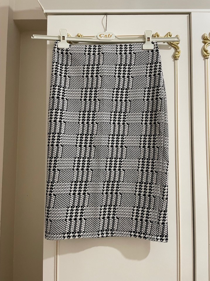 Gri ekose desenli, pileli ve normal boy midi etek. Sentetik kumaştan üretilmiş, ofis şıklığı için uygun modern tarzda.