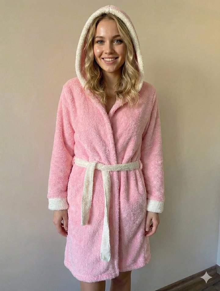 Şapkalı kadın ev giyim sabahlık pembe polar. Çeşitli bedenleri mevcuttur. #biricikicgiyim #polar #sabahlık #evgiyim #kadıngiyim