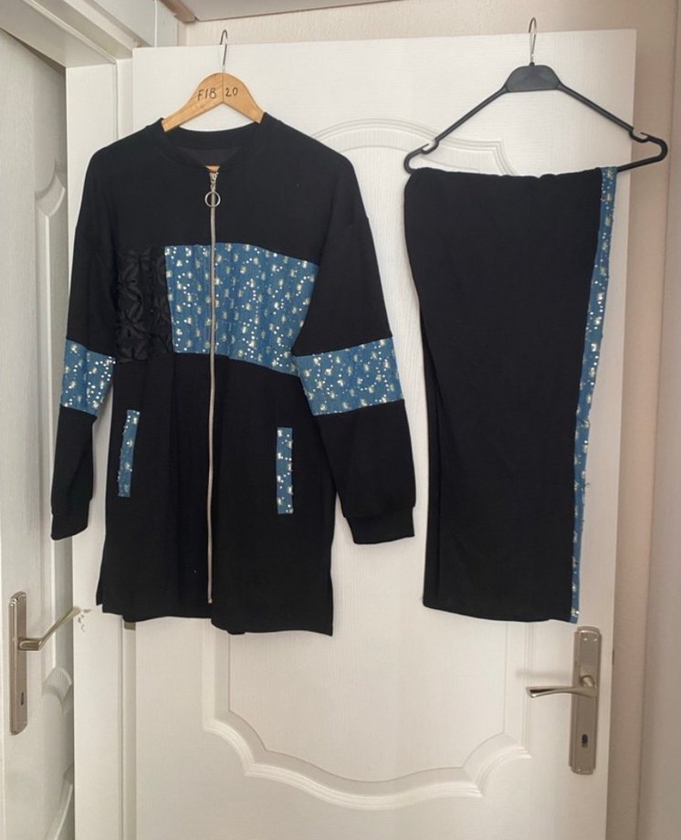 Kadınlar için fermuarlı, uzun kollu denim üst ve uyumlu uzun pantolonlu eşofman takımı. Mavi detayları ve bisiklet yaka ile sokak stili için uygundur.