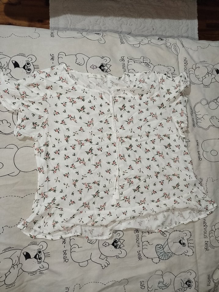 Pamuklu, kısa kollu, beyaz bluz; nakış detaylı ve fırfırlı. Salaş kesimi ve kayık yaka ile bohem tarzını yansıtıyor.