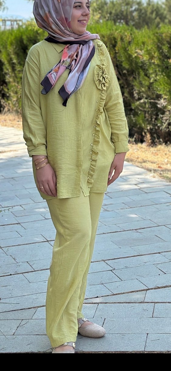 Kadınlar için fıstık yeşil keten kumaştan, bol kesim, uzun kollu, düğmeli ve yaka detaylı uzun takım. Günlük kullanıma uygun, rahat ve şık.