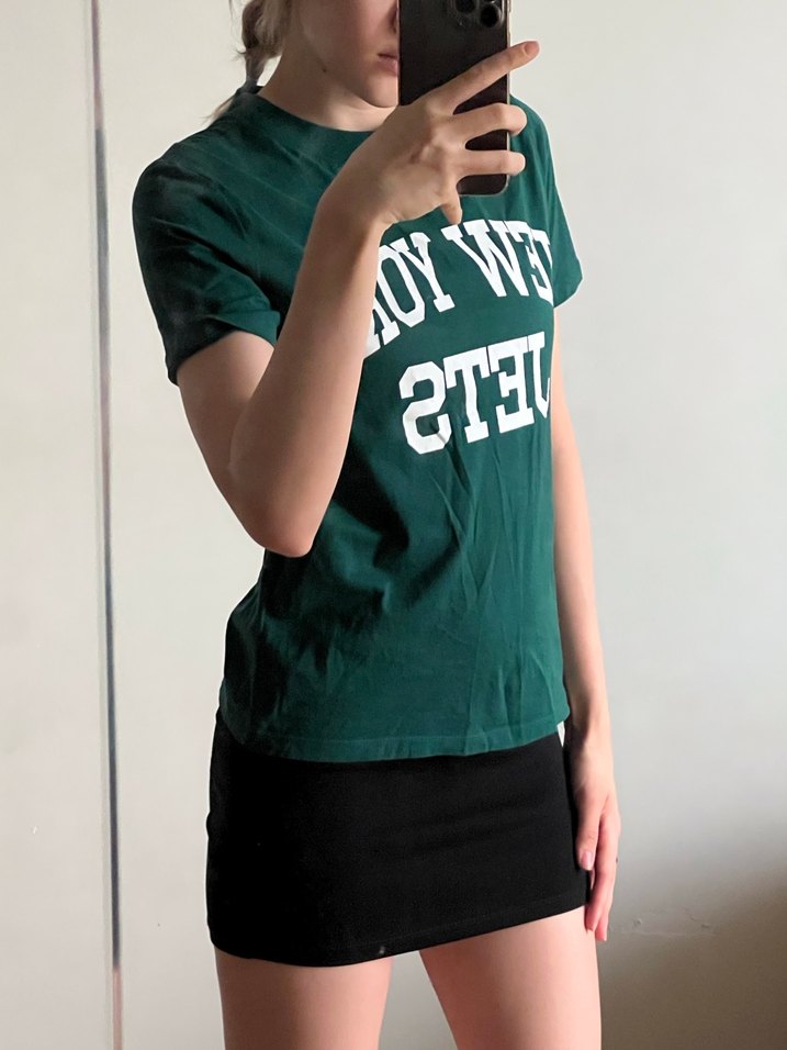 Kadın fit kesim tişört, kısa kollu ve yuvarlak yakalı, yumuşak pamuk kumaştan yapılmış koyu yeşil renkte baskılı tasarıma sahiptir.